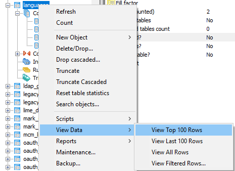 c) Expand Tables and locate the languages table. Right click and select View Data -> View Top 100 Rows, as in the following example: